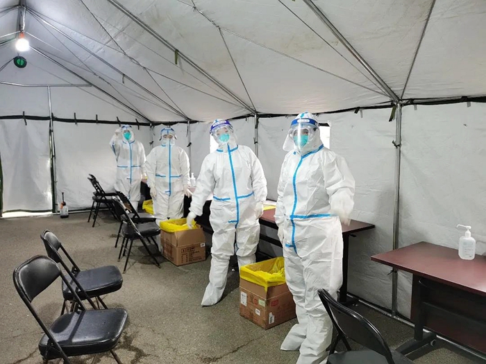 采樣期間,因人員較多,采樣工作都在室外進行。工作在最低溫度達到零下10度左右的環境里,42名應急隊員穿戴全副武裝的防護服,不僅要直面寒冷天氣的侵襲,還要克服醫用防護服、醫用防護眼鏡、防護口罩等一層層防護用品所帶來的不便。