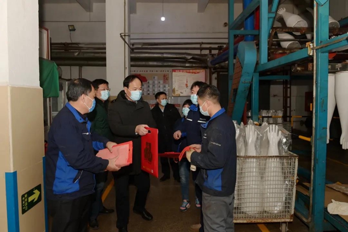 張時明一行考察了華騰橡塑公司生產現場,華騰美居酒店的“暖心驛站”,親切慰問堅守在一線崗位的職工和困難職工代表,帶去慰問品的同時也送上了親切的問候和真情關懷。