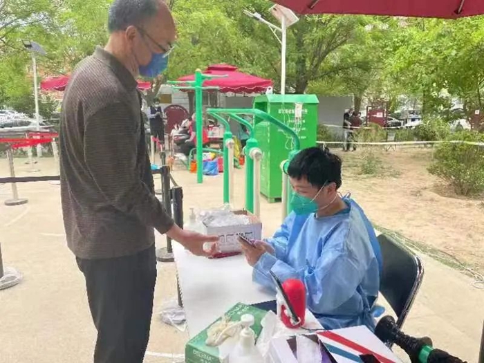 共產黨員楊帆在潘家園街道潘家園東里社區參加核酸檢測現場秩序維護或信息錄入工作。