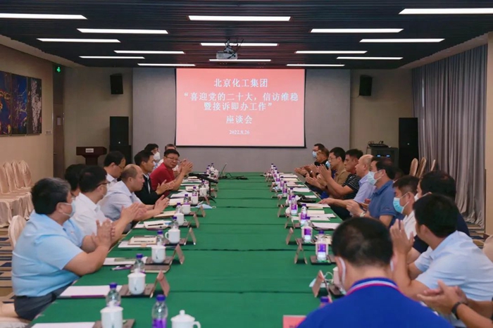 8月26日下午,北京化工集團黨委召開“喜迎黨的二十大,信訪維穩和接訴即辦工作”座談會。黨委書記、董事長王國華出席會議并作總結講話,黨委常委、副總經理韓寶海,黨委委員、副總經理李效軍出席座談會。黨委副書記吳瑞峰主持會議。