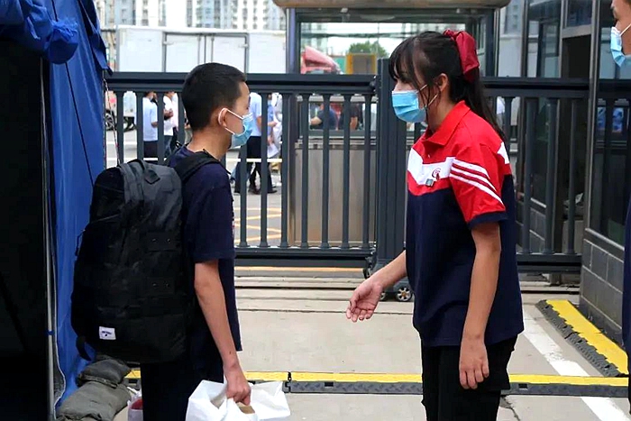 學(xué)生進入班級后再次檢查體溫,確認(rèn)同學(xué)們的健康狀況。