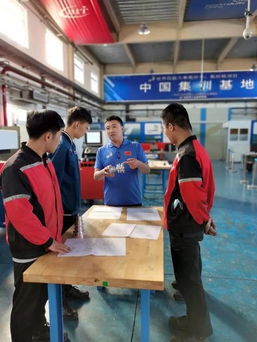 和王展超經歷相似,韓方旭,機電一體化專業技師畢業后,也選擇了留校任教,反哺母校教育事業。他們精心培養的選手殷成浩、謝虎、王帥等,不負眾望,在世界技能大賽上屢創佳績。數控車選手王帥在43屆世界技能大賽中獲優勝獎,機電一體化選手殷成浩、謝虎在45屆世界技能大賽中獲銀牌。他們繼承了導師的衣缽,選擇留校,繼續培養世賽選手。