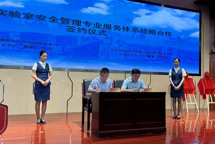 6月27日下午,亦莊醫藥產業園危化品統一配送服務平臺、科研實驗室安全生產教育培訓學院揭牌儀式舉行,北京亦莊國際生物醫藥投資管理有限公司黨委書記尹希杰,華騰化工黨總支書記、董事長李磊代表雙方簽署了戰略合作協議,經開區城市運行局相關領導,醫藥園相關單位,華騰化工、華騰旌凱相關領導出席簽約和揭牌儀式,近百人參加。