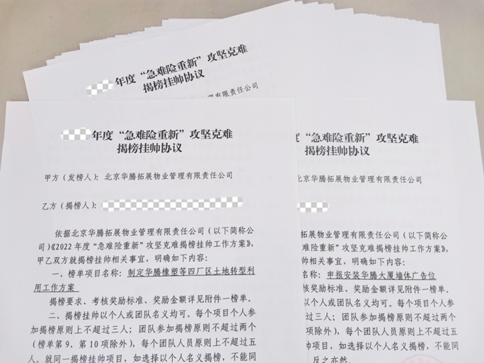 在華騰拓展年初開展的急難險重新“揭榜掛帥”活動中,華騰大廈團(tuán)隊所揭的榜,直指大廈寫字樓經(jīng)營開發(fā)的“痛點”“難點”。面對任務(wù)明確、目標(biāo)清晰的榜單,這個團(tuán)隊心中有壓力,但更有干勁兒和沖勁兒。“好像前面有一座堡壘,你的任務(wù)就是攻下它!”大廈員工說,“我們得想辦法,老辦法不成,就得想新辦法、出新招,現(xiàn)在我們都在圍繞揭榜轉(zhuǎn),團(tuán)隊的積極性都給調(diào)動起來了。”